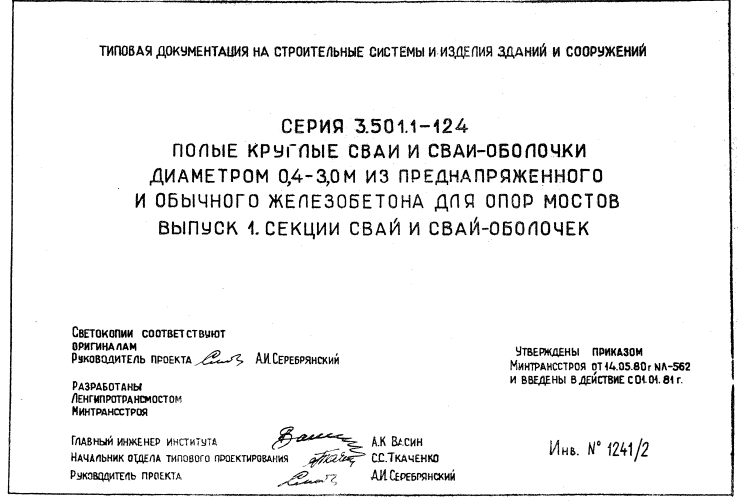 Серия 3.501.1-124 Полые круглые сваи и сваи-оболочки диаметром 0.4-0.3м из преднапряженного и обычного железобетона для опор мостов