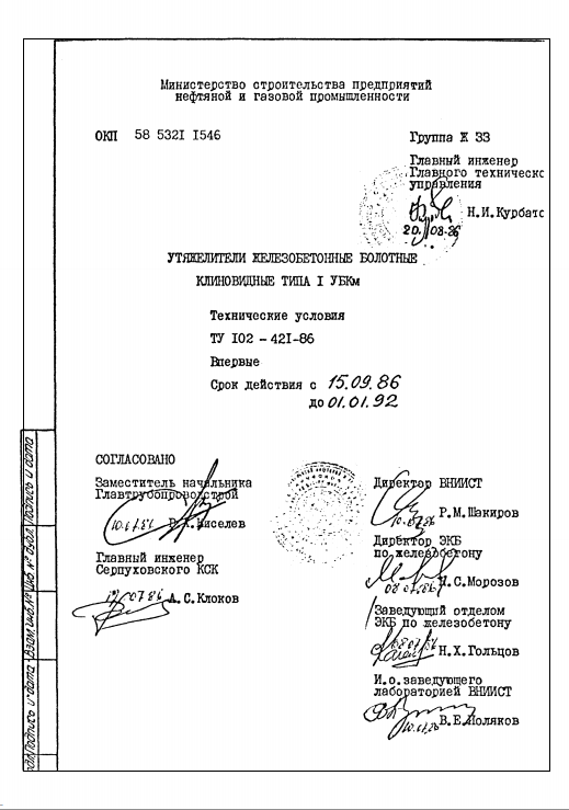 ТУ 102-421-86. Утяжелители железобетонные болотные клиновидные для балансировки трубопроводов УБКМ