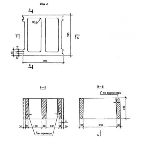 Камни для вентиляционных каналов КВ 39. Унифицированные изделия в форме прямоугольного параллелепипеда. В конструкциях запроектированы сквозные отверстия различной формы.