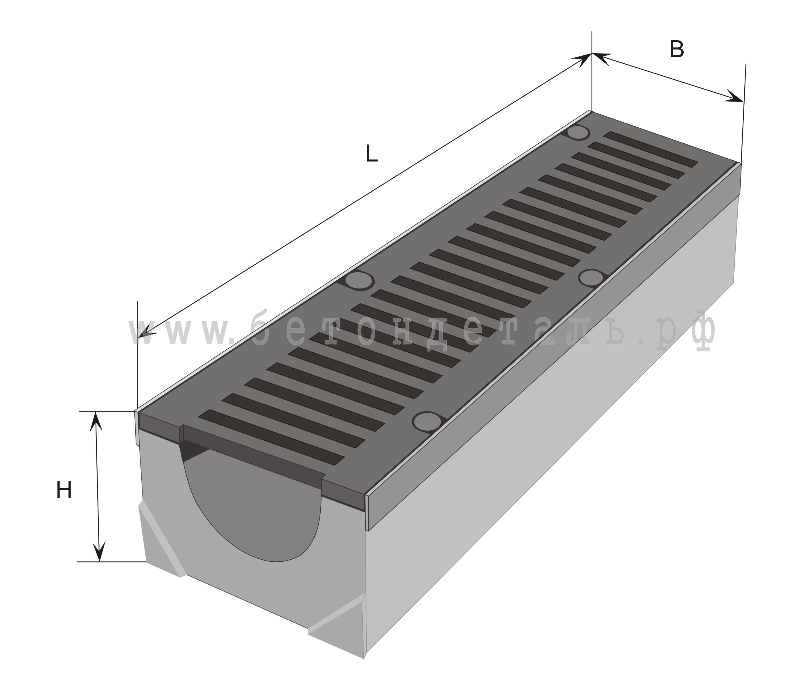 Маркировка  водоотводных лотков представляет собой цифробуквенный набор, включающий в себя  условные обозначения наименования изделия, глубины лотка, ширины и длины в дециметрах.